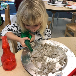 3-Day paleontologists (a new word we discussed) are really enjoying the study of dinosaurs. We started the week by carefully hatching dinosaur eggs made of baking soda and water. The children used vinegar in spray bottles and sticks to carefully dissolve and break apart the eggs to make a dinosaur discovery! Other activities this week included making dinosaur feet. We painting all the tissue boxes Monday and Wednesday and on Friday we added sharp claws. We plan to use Laurie Berkner's We Are the Dinosaurs to choreograph a dinosaur parade through 5-Day and Pre-K, wearing our new dinosaur feet!