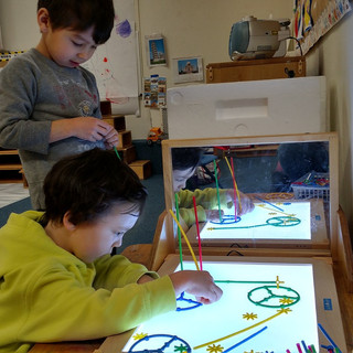 5-Day started their week cuddling Barn Babies. The children loved holding the kittens, bunnies and chickens. Brushing a pot-bellied pig was a lot of fun, as was playing with puppies and a teething baby goat. After our two day snow break the children had many measuring opportunities. Using cubes, they measured a variety of objects comparing them by size and a self-correcting game which they also enjoyed looking at tall vs. short for comparison. Using their names as measurement, the children looked at how many letters comprised each name, leading to a lot of discussion about longest and shortest, same and different. Six children have 4 letters in their name, and one has nine letters. We then put them on a graph for a visual chart. The children had truck races in the block area. We set up some ramps, paint, paper and trucks. The trucks got dipped in the paint and off they went down the ramp onto the paper. Pipes were added to the tables for some connecting skills and collaborative building. With table top easels, 5-Day pretended to be architects, complete with graph paper, blue marking implements and rulers.