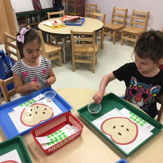 The 5-Day class welcomed in October and we are thrilled about our many Fall classroom activities! The children have been very busy sorting, shopping, selling, and cooperating in dramatic play at our “Farmers' Market.” The discovery table is filled with natural objects to explore, including acorns we found on our playground. We have noticed the weather cooling down and have observed the leaves beginning to change.