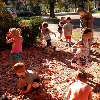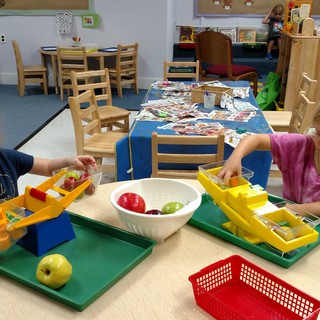 This week, 5-Day continued delving into all things apples, but added some more fun Fall items. With scales, the children explored the concept of balance. They used apples, weights, blocks and bears to find ways to get even weights on both sides. As they worked together, we were pleased to see many cooperative attempts, the use of math language and much laughter. After our nature hunt, we added the pine cones and acorns that we found to the scales and put them in the discovery table to extend their learning through additional practice using different materials.