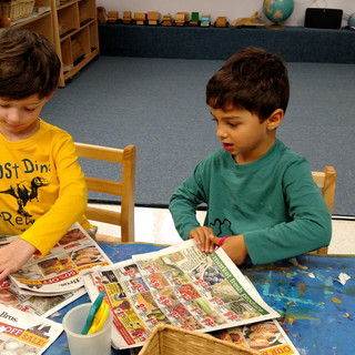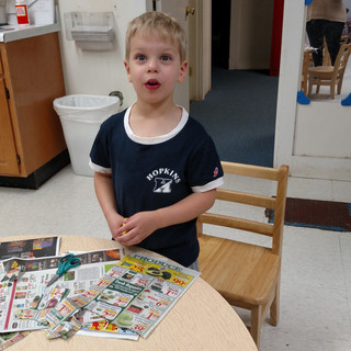 At another activity table, the class used their fine motor skills to cut out "things that grow outside" from supermarket flyers. One noteworthy statement overheard was, "Grapes grow outside, but cereal doesn't."